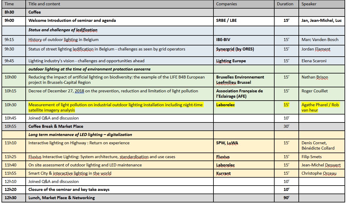 You will hear from leading experts including Marc Vanden Bosch (IBE-BIV), Jordan Flament (Synergrid – ORES), Elena Scaroni (Lighting Europe), Nathan Brison (Leefmilieu Brussel / Bruxelles Environnement), Roger Couillet (Association Française de l’Éclairage – AFE), Agathe Pharel (Laborelec), Rob Van Heur (Laborelec), Denis Cornet (SPW / LuWa), Bénédicte Collard (SPW / LuWa), Filip Smets (Fluvius), Jean-Michel Deswert (Laborelec) and Christophe Orceau (Kurrant), sharing practical insights, real-world experience and forward-looking perspectives on smart and sustainable outdoor lighting. A technology market place on lighting performance and environmental integration, will provide a forum to exchange further.